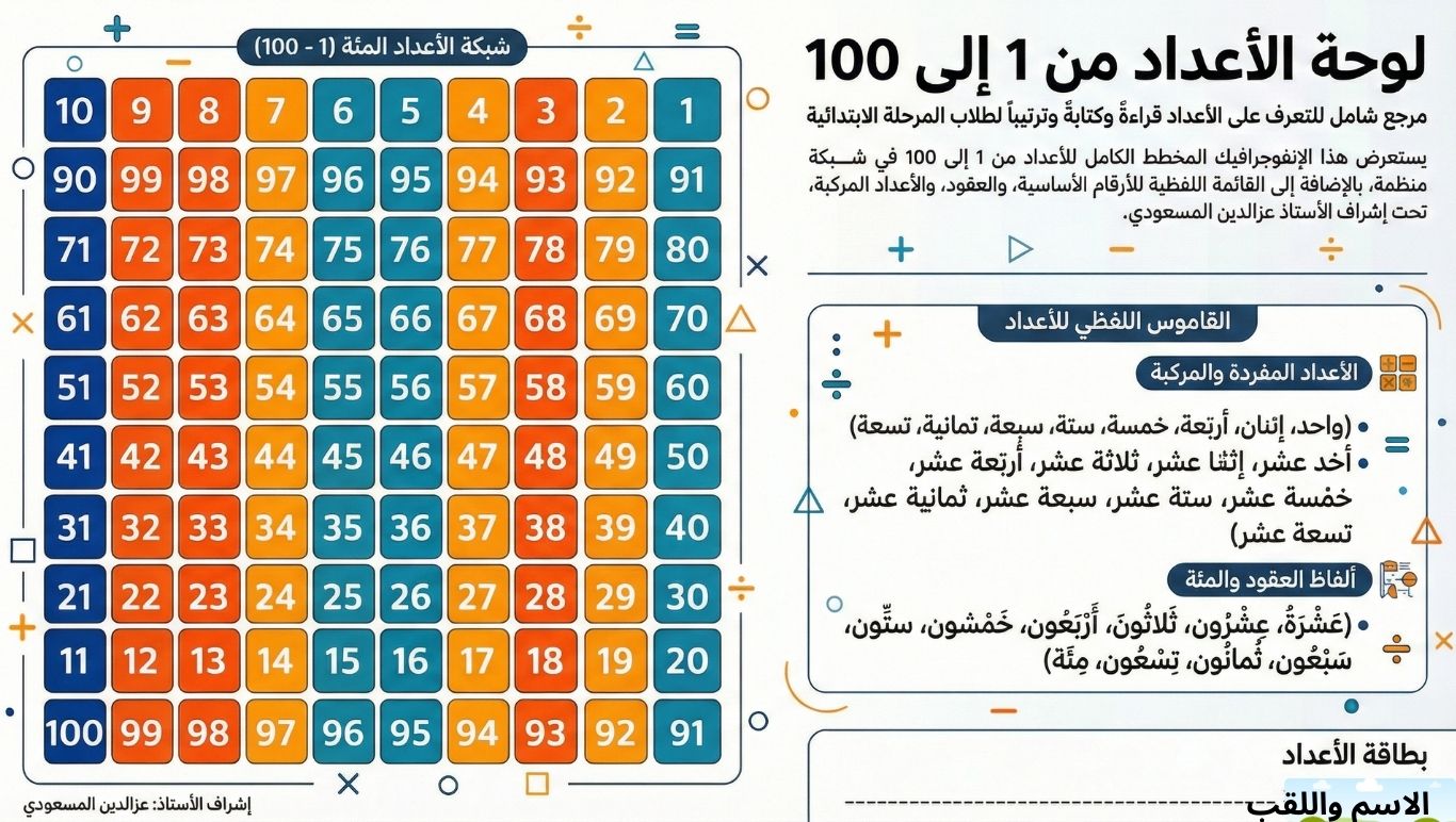 إن تعليم الأرقام هو رحلة تراكمية. استخدام لوحة الأعداد من 1 إلى 100 يكسر حاجز الخوف من الرياضيات ويحولها إلى تجربة بصرية ممتعة.